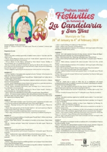 Tías, 18 de enero de 2024.- Las fiestas patronales de Tías en honor a Nuestra Señora de la Candelaria y San Blas comenzarán el día 26 de enero con el pregón a cargo del club de fútbol Sporting Tías, que celebra el 50 aniversario de andadura. El programa, organizado por la comisión de fiestas y patrocinado por el Ayuntamiento, incluye un total de 58 actos hasta el 4 de febrero.