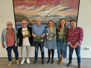 El alcalde, José Juan Cruz, y la concejala de Fiestas, Miriam Hernández, acompañados de parte del equipo de trabajo de la concejalía, recibieron las distinciones por parte de los representantes de la plataforma, Yaiza Leal y Eudes Leal, y del folclorista y escritor Emilio Fernández.
