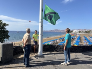 Tías, 27 de octubre de 2025.- El Ayuntamiento de Tías, a través de la Concejalía de Playas, ha izado hoy las banderas en las cuatro playas más relevantes de Puerto del Carmen, Playa Grande, Playa Chica, Matagorda y Pocillos, con pictogramas diseñados específicamente para que las personas con daltonismo puedan identificar el estado de la mar.
