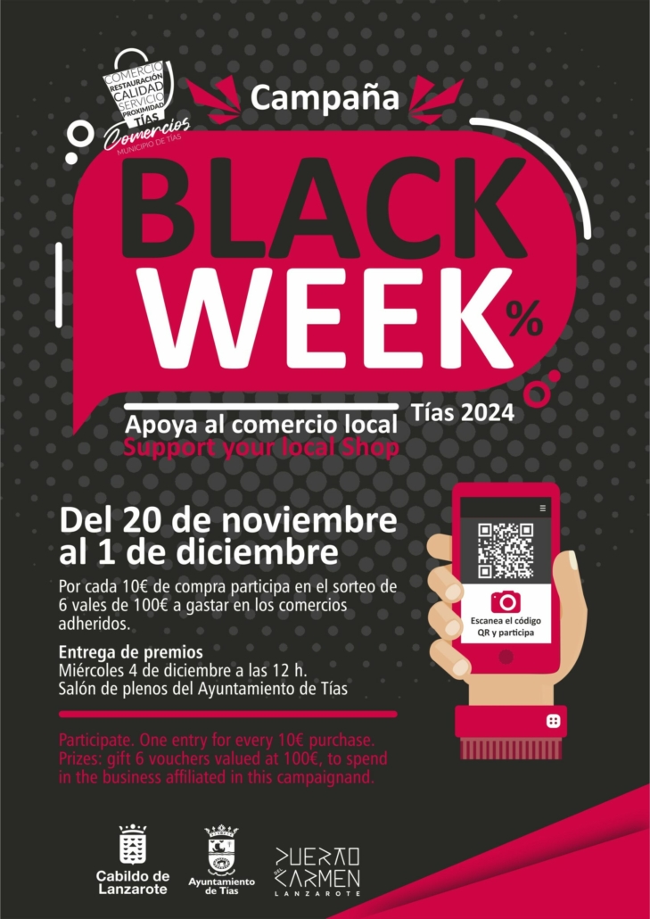 Tías, 18 de noviembre de 2024.- El Ayuntamiento de Tías anuncia el inicio de la campaña Black Week, que se desarrollará desde el 20 de noviembre hasta el 1 de diciembre con la participación de numerosos comercios del municipio. Desde la corporación se anima a la ciudadanía a colaborar con el pequeño empresario realizando sus compras en las tiendas del municipio.