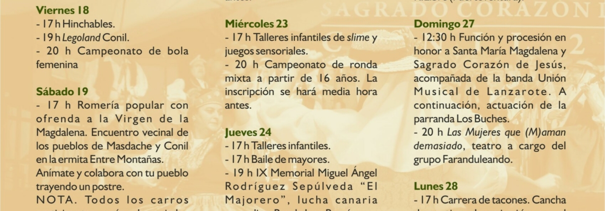 Tías, 8 de julio de 2025.- El Ayuntamiento de Tías invita a la ciudadanía a disfrutar de las Fiestas de La Magdalena y el Sagrado Corazón de Jesús en el pueblo de Conil, que se celebrarán del 18 al 28 de julio. El programa contempla el popular asadero, concierto de Los Lola, el memorial de lucha canaria Miguel Ángel Rodríguez Sepúlveda y el encuentro folclórico Juan Ramón Rodríguez Sepúlveda.