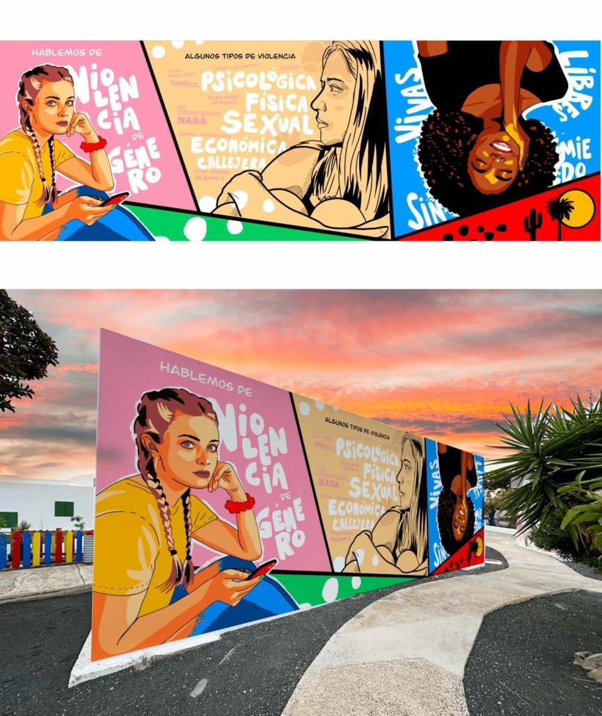 Pepa González explica que los nuevos murales han sido diseñados por el artista Iván T. bajo la premisa de la inclusión de mensajes contra la violencia de género, tanto psicológica como física, sexual, económica y callejera. Esta propuesta artística cuenta con la colaboración del equipo de baloncesto del municipio, Magec Tías Contra la Violencia de Género, que recibe una subvención anual desde el área de Igualdad a través del Pacto de Estado.