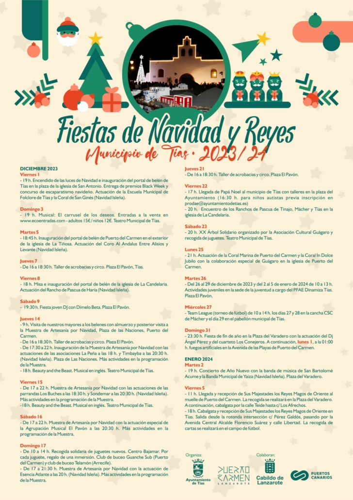 – Del 26 al 29 de diciembre de 2023 y del 2 al 5 de enero de 2024 de 10 a 13 h. Actividades juveniles en la sede de la juventud a cargo del PFAE Dinamiza Tías. Plaza El Pavón.