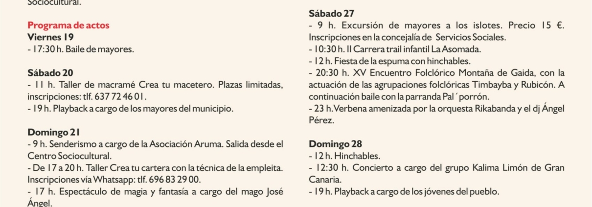 El programa de las fiestas, que se puede consultar en la página web del Ayuntamiento y en sus redes sociales, incluye talleres infantiles, playback, senderismo, Festival de La Canción, bailes y conciertos, carrera infantil, fiesta de la espuma, el tradicional Encuentro Folclórico Montaña de Gaida y asadero popular, entre otros actos.
