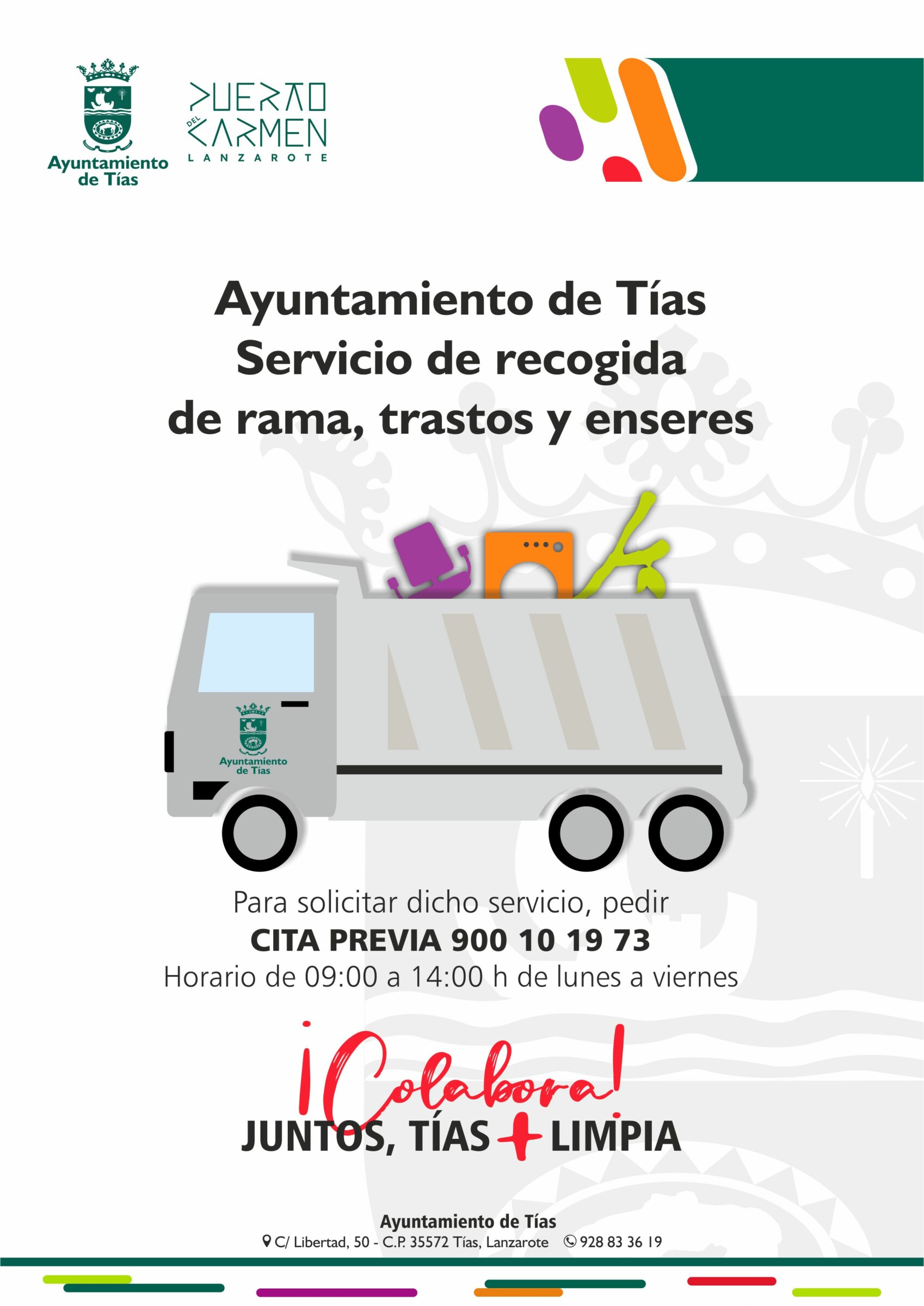 El Ayuntamiento de Tías, dentro del plan de mejora del municipio, pone a disposición de todos los ciudadanos un servicio gratuito de recogida, enseres, poda doméstica y otros objetos de procedencia exclusivamente domiciliaria.