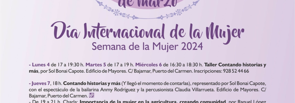 La programación arrancará con un taller de cuentacuentos impartido por la narradora Sol Bonai Capote, conocida por extender el poder social, educativo, evocador y tranquilizador de los cuentos. Su taller, denominado Contando historias y más se impartirá en el Edificio de Mayores de Puerto del Carmen, en la calle Bajamar, los días 4 y 5 de marzo, de 17 a 19:30 horas, y el 6 de marzo, de 16:30 a 18:30 horas. Se precisa inscripción previa en el teléfono del área de Bienestar y Familia 928 524466.