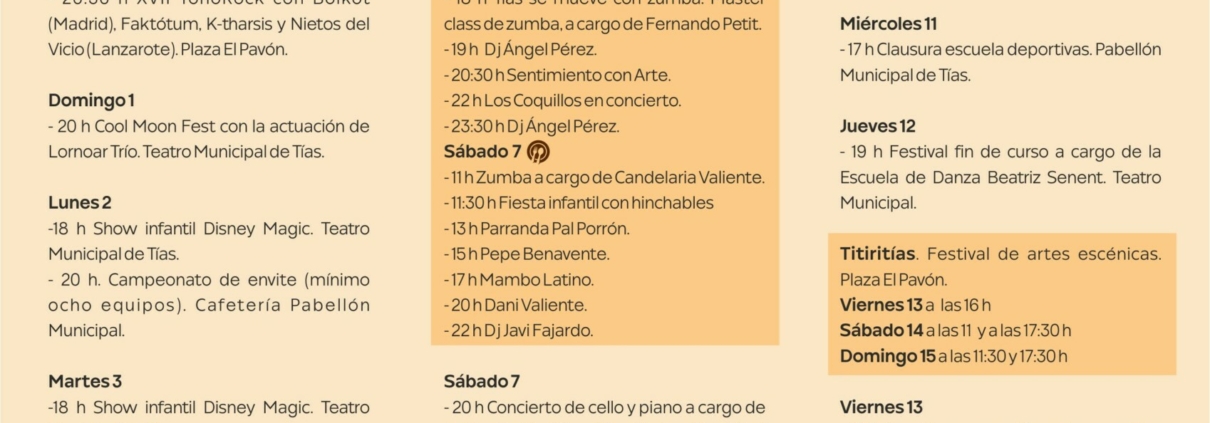 La concejala de Fiestas, Miriam Hernández, hace hincapié en “la ilusión y el trabajo que hay detrás de estas fiestas, que son una oportunidad para reforzar nuestra identidad y reunir a toda la comunidad en torno a la cultura, la música y la tradición”. Hernández precisó que “la programación de este año está pensada para todos los públicos, con propuestas de calidad, gratuitas y accesibles, que nos permitirán disfrutar de Tías con alegría y en convivencia”.