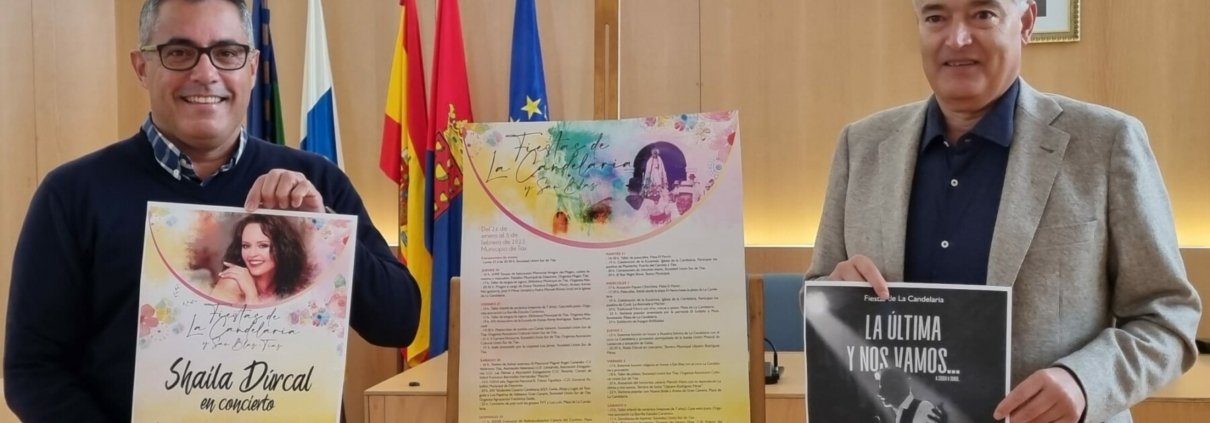 El Ayuntamiento de Tías presentó hoy el cartel de las fiestas en honor a la patrona del municipio, Nuestra Señora de La Candelaria, con una programación organizada por la Comisión de Fiestas y patrocinada por el consistorio. Desde el 26 de enero hasta el 5 de febrero se desarrollarán 48 actos, entre los que destacan las actuaciones de Shaila Durcal, Manolo Vieira y Pepe Benavente.