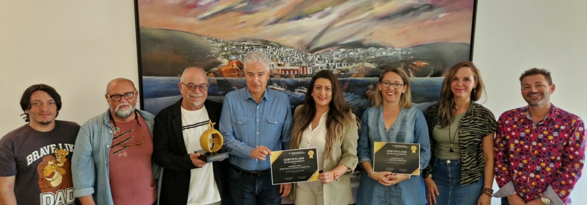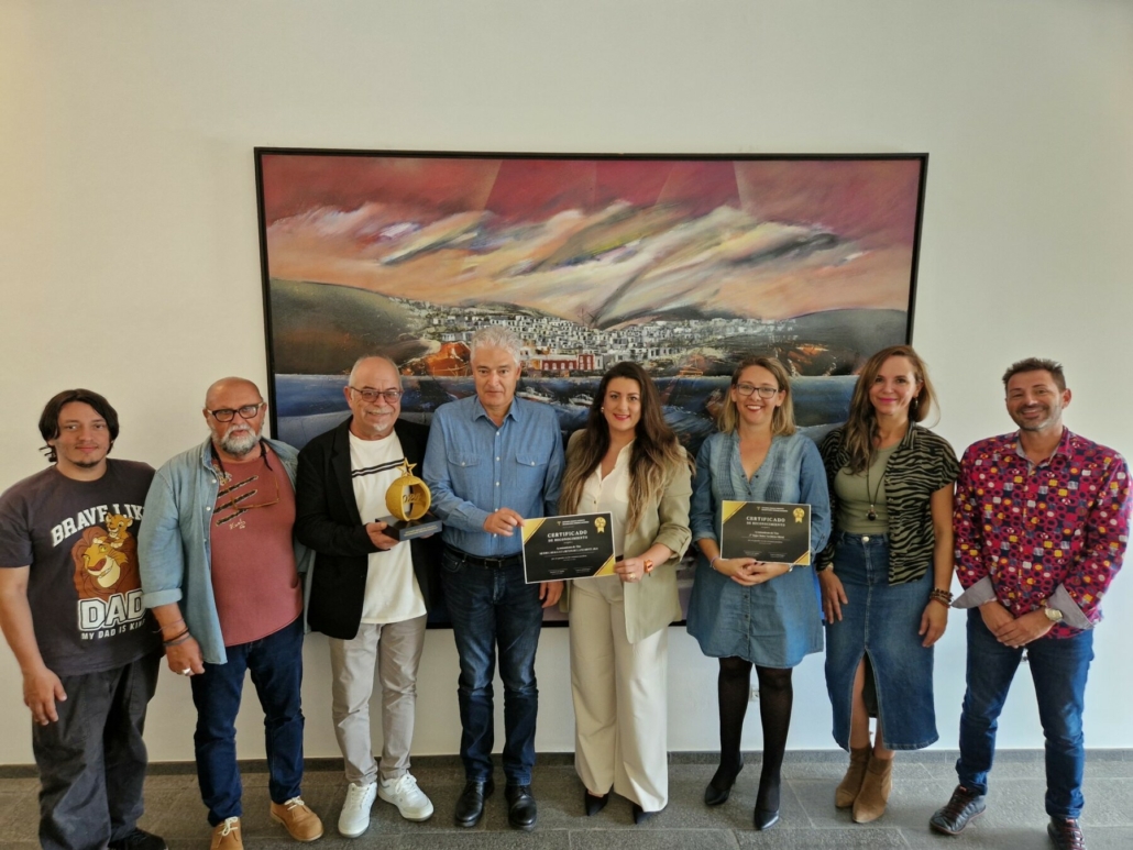 El alcalde, José Juan Cruz, y la concejala de Fiestas, Miriam Hernández, acompañados de parte del equipo de trabajo de la concejalía, recibieron las distinciones por parte de los representantes de la plataforma, Yaiza Leal y Eudes Leal, y del folclorista y escritor Emilio Fernández.